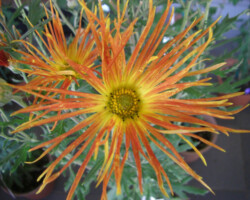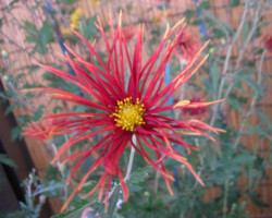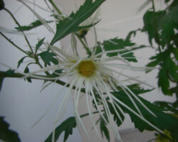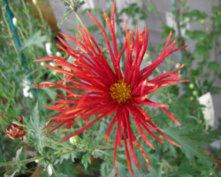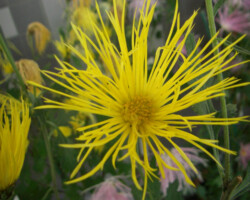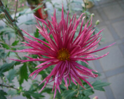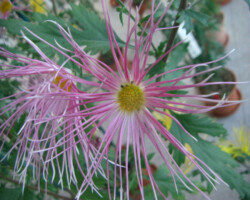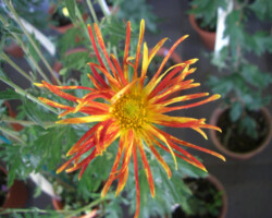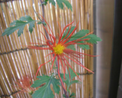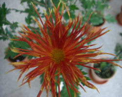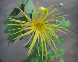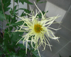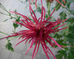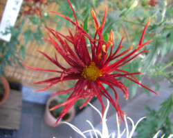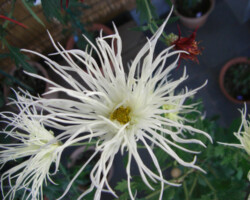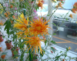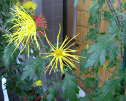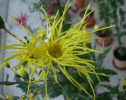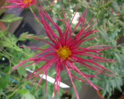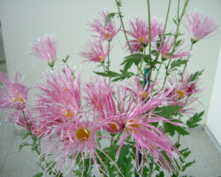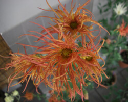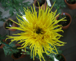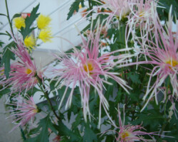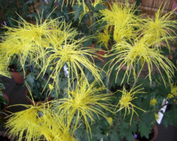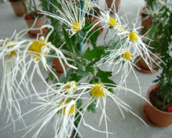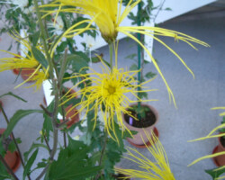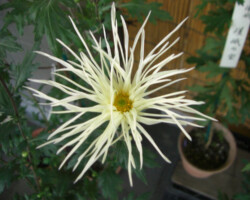 嵯峨菊は嵯峨天皇の御代、大沢池の菊ケ島に自生していた嵯峨野独特の野菊を、永年にわたって王朝の気品ある感覚をもって洗練し「天、地、人」の微妙な配置に仕立て上げた、格調高い菊である。古典菊の精華、嵯峨菊は1鉢に3本仕立て、草丈は殿上から鑑賞するのにちょうどよい高さの約2メートルに仕立てる。花は先端が三輪、中程に五輪下手に七輪と、七、五、三に。葉は下部を黄色、中程は緑、上の方は淡緑というように仕立て、春夏秋冬をあらわすことになっている。花弁は平弁で、54弁。長さは約10センチが理想とされ、色は嵯峨の雪(白)、右近橘(黄)、小倉錦(朱)、藤娘(桃)などの淡色が多く、あまり混植をしない。