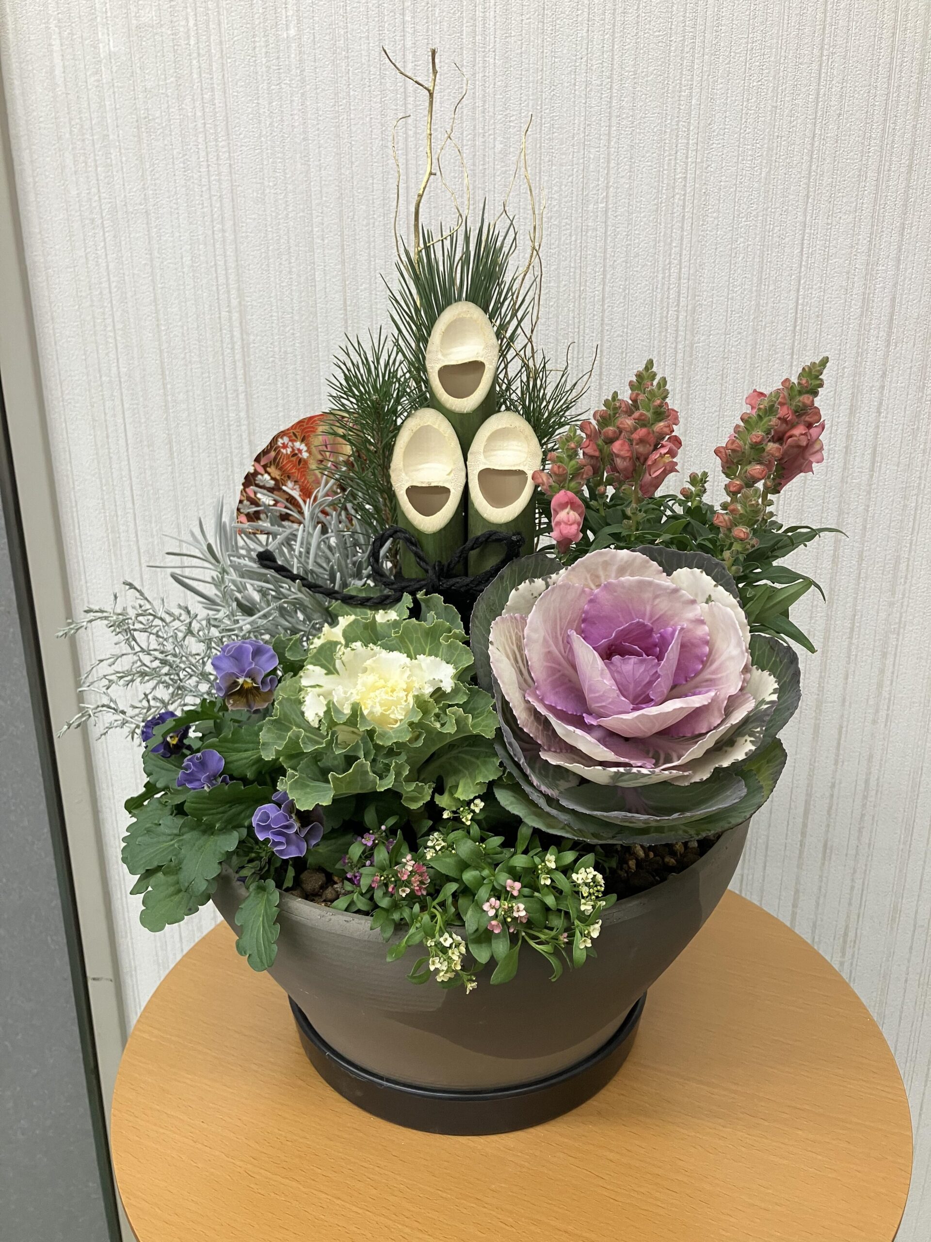 青竹を組んで門松風寄せ植えを作ります。玄関に飾り、新年を迎えましょう。